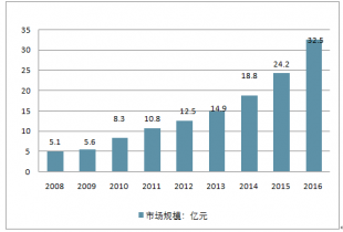2008-2016年中國機(jī)器視覺行業(yè)市場規(guī)模走勢