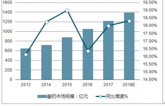 2016年中國酸奶行業(yè)市場規(guī)模達到1010.17億元,市場首次突破千億元。2017年牛奶銷售額同比增長4%;而酸奶銷售額首次超過牛奶,約為1192億元,同比增長18%,增速遠快于牛奶。預測2019年中國酸奶行業(yè)市場規(guī)模將突破1400億元。