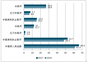 2017年末,全國中醫(yī)藥衛(wèi)生人員總數達66.4萬人,比上年增加5.1萬人增長8.3%)。其中:中醫(yī)類別執(zhí)業(yè)助理)醫(yī)師52.7萬人,中藥師士)12.0萬人。兩類人員較上年有所增加。