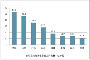 據垃圾焚燒發電各省上網電量排行榜顯示,浙江、江蘇和廣東省位列前三。其中,浙江省以上網電量53.1億千瓦時位列榜首。此外,浙江省在垃圾焚燒發電各省項目數量排名、垃圾焚燒發電各省裝機容量排名排名均列第.一。
