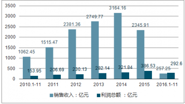 2010-2016年11月我國(guó)生物制藥行業(yè)銷售收入及利潤(rùn)走勢(shì)
