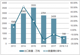 2019年1-5月中國(guó)出口肥料748萬(wàn)噸,同比下降18%;縱觀近五年中國(guó)肥料出口數(shù)量情況,年均復(fù)合增長(zhǎng)率為6.94%。
