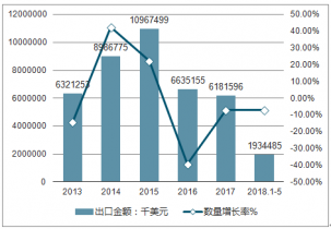 2019年1-5月中國(guó)肥料出口金額為19.34億美元,同比下降7%;縱觀近五年中國(guó)肥料出口金額情況,年均復(fù)合增長(zhǎng)率為-0.56%。
