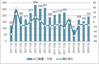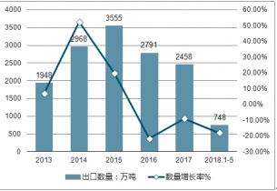2019年1-5月中國出口肥料748萬噸,同比下降18%;縱觀近五年中國肥料出口數(shù)量情況,年均復(fù)合增長率為6.94%。