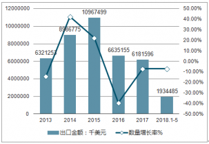 2019年1-5月中國肥料出口金額為19.34億美元,同比下降7%;縱觀近五年中國肥料出口金額情況,年均復(fù)合增長率為-0.56%。