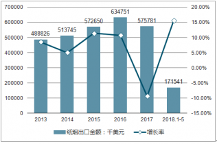 2019年1-5月中國(guó)紙煙出口金額為1.72億美元,同比增長(zhǎng)15.7%。