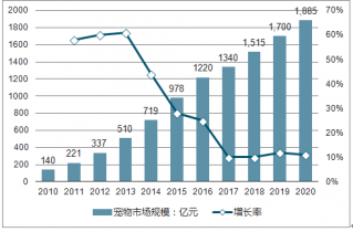 2010-2020年中國寵物行業(yè)市場規(guī)模及增長率走勢