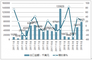 2017-2019年各月中國紙煙出口金額及增長率走勢