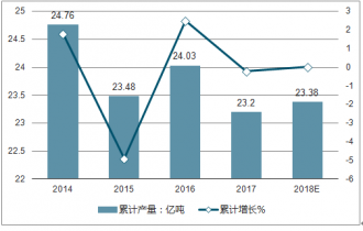 近幾年來(lái),中國(guó)水泥產(chǎn)量基本保持穩(wěn)定,水泥年產(chǎn)量在23-24億噸左右。具體來(lái)看:2017年中國(guó)水泥累計(jì)產(chǎn)量為23.2億噸,累計(jì)下滑0.2%。到2018年中國(guó)水泥累計(jì)產(chǎn)量將達(dá)23.38億噸,累計(jì)增長(zhǎng)約1.1%。