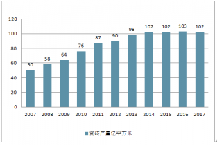 2007-2017年全國(guó)瓷磚產(chǎn)量(單位:億平方米)