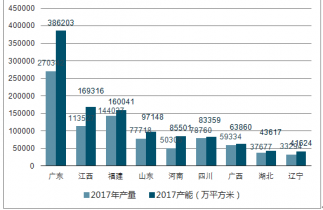 2017 年各省份瓷磚產能及產量統(tǒng)計