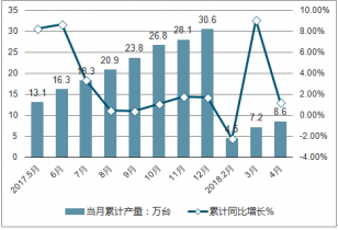 2018年4月,中國金屬成形機床產(chǎn)量2.4萬臺,同比增長4.3%。2018年1-4月中國金屬成形機床累計產(chǎn)量8.6萬臺,累計增長1.2%。