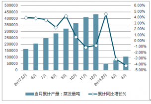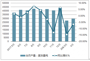 2018年4月,中國工業(yè)鍋爐產(chǎn)量29689.7蒸發(fā)量噸,同比減少6.4%。2018年1-4月中國工業(yè)鍋爐累計產(chǎn)量104937.3蒸發(fā)量噸,累計減少4.2%。