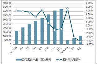 2018年4月,中國(guó)工業(yè)鍋爐產(chǎn)量29689.7蒸發(fā)量噸,同比減少6.4%。2018年1-4月中國(guó)工業(yè)鍋爐累計(jì)產(chǎn)量104937.3蒸發(fā)量噸,累計(jì)減少4.2%。