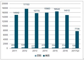 2017年電視劇甲種制作許可證機構(gòu)數(shù)量下降; 2010-2017年電視劇備案總數(shù)年復(fù)合增速4.5%,整體趨于穩(wěn)定;電視劇發(fā)行數(shù)量下降,發(fā)行率逐年遞減。