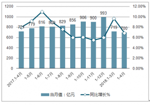 2017-2018年中國(guó)限額以上單位當(dāng)月餐飲收入(億元)
