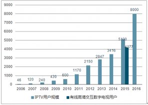 2006-2016年IPTV用戶(hù)規(guī)模與有線高清交互數(shù)字電視用戶(hù)(單位:萬(wàn)戶(hù))