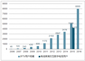 2006-2016年IPTV用戶規(guī)模與有線高清交互數(shù)字電視用戶(單位:萬(wàn)戶)