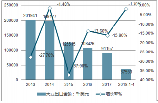 2018年1-4月中國大豆出口金額為3755.3萬美元,同比略降1.7%;縱觀近五年中國大豆出口金額情況,年均復(fù)合增長率為-18.03%。