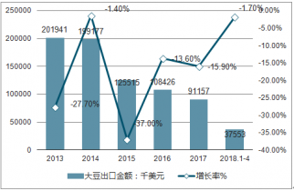 2018年1-4月中國大豆出口金額為3755.3萬美元,同比略降1.7%;縱觀近五年中國大豆出口金額情況,年均復(fù)合增長率為-18.03%。