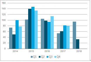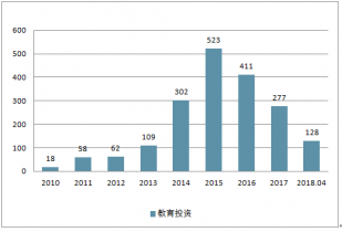 從融資數(shù)量看, 2018 年前 4 月數(shù)據(jù)同比增 80%,呈現(xiàn)逐步回暖趨勢。 分年度來看, 教育行業(yè)一級(jí)市場投資在 2014 至 2017 年保持高熱度。 2015 年達(dá)到頂峰 523 起,隨后兩年市場逐漸降溫,教育投資市場趨于冷靜。 2017 年以來, 教育投資大體呈現(xiàn)逐季度上升態(tài)勢,教育投資逐漸回暖, 2018 年數(shù)據(jù)顯示出進(jìn)一步上升趨勢, 前 4 個(gè)月同比增長 80%。