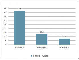 工業(yè)機(jī)器人連續(xù)五年成為全球第.一大應(yīng)用市場(chǎng),服務(wù)機(jī)器人需求潛力巨大,特種機(jī)器人應(yīng)用場(chǎng)景顯著擴(kuò)展,核心零部件國(guó)產(chǎn)化進(jìn)程不斷加快,創(chuàng)新型企業(yè)大量涌現(xiàn),部分技術(shù)已可形成規(guī)模化產(chǎn)品,并在某些領(lǐng)域具有明顯優(yōu)勢(shì)。2017年,工業(yè)機(jī)器人是機(jī)器人市場(chǎng)主要產(chǎn)品,所占整體比重高達(dá)67.2%,市場(chǎng)規(guī)模為42.2億美元。此外,得益于互聯(lián)網(wǎng)巨頭對(duì)機(jī)器人在服務(wù)場(chǎng)景應(yīng)用的投入,服務(wù)機(jī)器人所占比重也超過(guò)20%,市場(chǎng)規(guī)模達(dá)到13.2億美元。