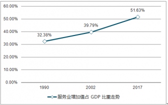 1990-2017年中國服務(wù)業(yè)增加值占 GDP 比重走勢