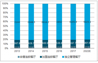 中國餐飲服務(wù)市場 穩(wěn)步快速增長,行業(yè)總規(guī)模由 2013 年 2.64 萬元增長至 2017 年 3.96 萬億, CAGR達(dá) 10.7%,預(yù)計(jì) 2017 至 2022 年將保持 CAGR9.6%增速,達(dá)到 6.28 萬元,其中,中餐是最大組成部分,2017 年市場占比達(dá)到 80.5%,2013-2017 年 CAGR 達(dá) 9.9%;但市場高度分散,獨(dú)立管理的餐廳收入規(guī)模占比達(dá)到 81%,火鍋是中餐中最大的細(xì)分市場。