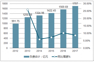 2012-2017年工業(yè)自動(dòng)控制系統(tǒng)行業(yè)負(fù)債情況(單位:億元,%)