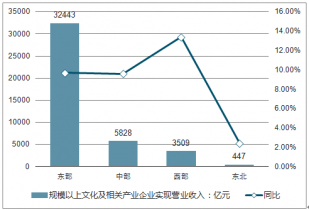 文化及相關產(chǎn)業(yè)9個行業(yè)的營業(yè)收入均實現(xiàn)增長。東部地區(qū)規(guī)模以上文化及相關產(chǎn)業(yè)企業(yè)實現(xiàn)營業(yè)收入32443億元,占全國76.8%,增長9.7%。;中部、西部和東北地區(qū)分別為5828億元、3509億元和447億元,增長9.6%、13.4%及2.4%。占全國比重分別為13.8%、8.3%和1.1%。