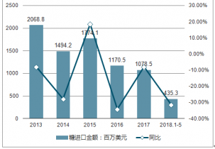 2013-2019年1-5月中國食糖進口額及增長率走勢