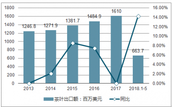 2019年1-5月,我國茶葉出口金額為663.7百萬美元,同比增長14.3%。,2013-2017年我國茶葉進口金額在2013年最低為1246.8百萬美元,同比增長19.6%;2017年為最高值達1610百萬美元,同比增長8.4%。