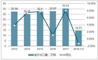 2019年1-5月,我國茶葉出口數(shù)量為14.51萬噸,同比下滑1.2%。2013-2017年我國茶葉出口在2014年最低為30.15萬噸,同比下滑7.5%;2017年為最高值達35.53萬噸,漲幅達8.1%。