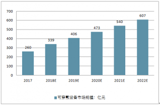 2017年中國可穿戴設(shè)備市場(chǎng)產(chǎn)值將超過260億元人民幣。預(yù)計(jì)到2022年我國可穿戴設(shè)備市場(chǎng)規(guī)模將達(dá)607億元左右。