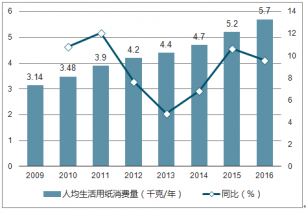 我國人均生活用紙消費量及增速