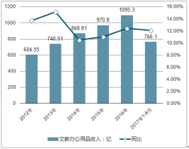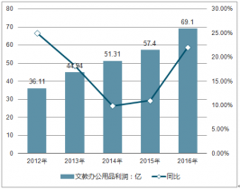 2012-2016 年我國文教辦公用品行業(yè)收入從 604.55億增長到 1095.3 億,年均復合增長 16.02%,利潤由 36.11 億增長到 69.1 億,年均復合增長 17.62%。 2017 年 1-8月份我國文教辦公用品行業(yè)實現(xiàn)收入 766.1 億,同比增 12.1%。 2017 年國內(nèi)大辦公文具(包括辦公家具、器材等)的市場規(guī)模超過萬億。未來,隨著我國經(jīng)濟的持續(xù)穩(wěn)定發(fā)展,辦公消費能力有望進一步提升,辦公文具市場前景良好。