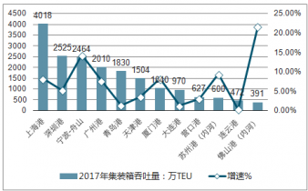 2017年中國(guó)TOP12港口吞吐量及增速(單位:萬(wàn)TEU,%)