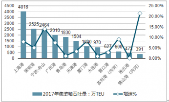 2017年中國TOP12港口吞吐量及增速(單位:萬TEU,%)