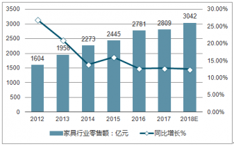 2012-2019年中國家具零售額及同比增長預(yù)測