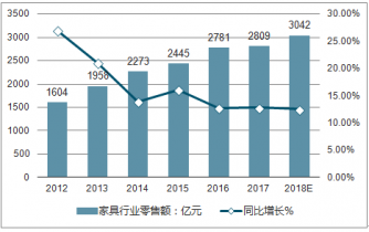 2012-2019年中國家具零售額及同比增長預(yù)測