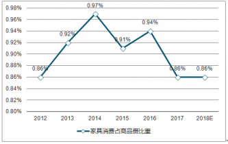 2012-2017年家具類消費占商品零售比重相對穩(wěn)定,比重基本維持在0.9%左右。預(yù)計2019年家具類消費在商品零售中占比會在0.86%左右。