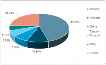 在2017年中國公有云IaaS市場廠商份額排行榜TOP5中,阿里云位居榜首,市場份額達到45.5%;騰訊云排名第二,市場份額為10.3%;中國電信排名第三,市場份額為7.6%,同比增長51%;位居第四的金山云,市場份額為6.5%,增長82%;AWS首次進入IaaS市場前五位,市場份額為5.4%。