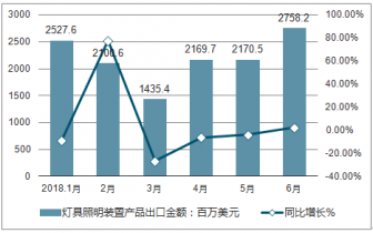 在2019年6月中國燈具照明裝置產(chǎn)品出口金額方面,6月中國燈具照明裝置產(chǎn)品出口金額2758.2百萬美元,同比增長2.4%。1-6月中國出口燈具照明裝置產(chǎn)品累計(jì)金額比去年的同時期增長2%.