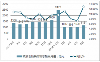 從糧油、食品類零售情況來看,2019年6月份糧油、食品類零售額達(dá)1151億元,與去年同期相比增長13%。2019年1-6月全國糧油、食品類累計(jì)零售額收入達(dá)6662億元,同比增長9.8%