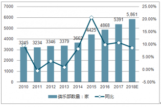 2010-2019年中國健身俱樂部數(shù)量及同比增速
