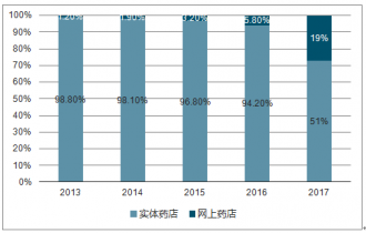 2013-2016 年我國(guó)實(shí)體藥店和網(wǎng)上藥店(含藥品和非藥品)銷售額占比
