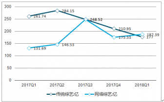 2018Q1網(wǎng)絡(luò)綜藝TOP100播放量為187.39億次,同比增長42.29%,高于傳統(tǒng)綜藝TOP100播放量的177.92億次。