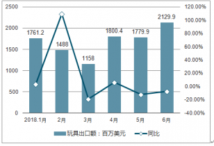 2019年6月中國玩具出口金額方面,6月中國玩具出口金額2129.9百萬美元,同比下降7.4%。1-6月中國出口玩具金額達9958.80百萬美元,比去年的同時期9803.5百萬美元,同比增長1.6%.雖然3月份的出口額同比下降過多,但總體2019年上半年是增長的。