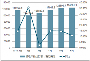 在2019年6月中國機電產品出口金額方面,6月中國機電產品出口金額124081.3百萬美元,同比增長11%。1-6月中國出口機電產品累計金額比去年的同時期增長15%.