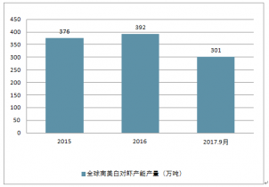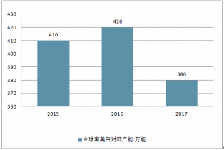 截止2017年9月,全球南美白對(duì)蝦產(chǎn)能是380萬噸,2016年是420萬噸。